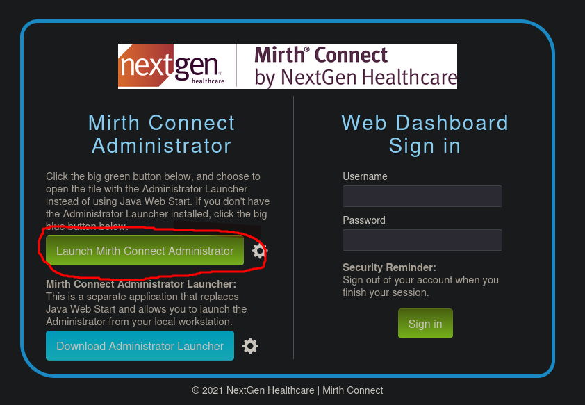 Clicking the “Launch Mirth Connect Administrator” button downloads a webstart.jnlp file.